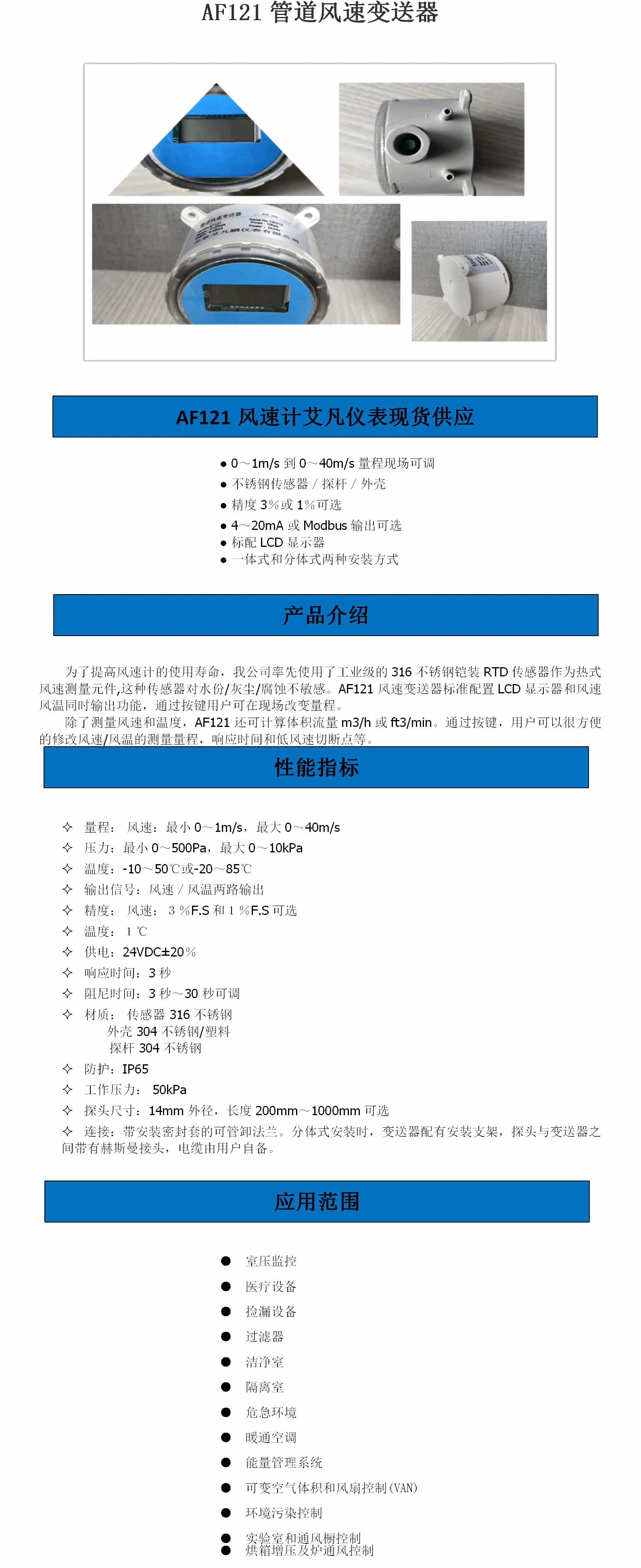 为了提高风速计的使用寿命,我公司率先使用了工业级的316不锈钢铠装RTD传感器作为热式风速测量元件,这种传感器对水份/灰尘/腐蚀不敏感。管道风速变送器标准配置LCD 显示器和风速风温同时输出功能,通过按键用户可在现场改变量程。除了测量风速和温度,AF121还可计算体积流量m3/h或ft3/min。通过按键,用户可以很方便的修改风速/风温的测量量程,响应时间和低风速切斯点等。