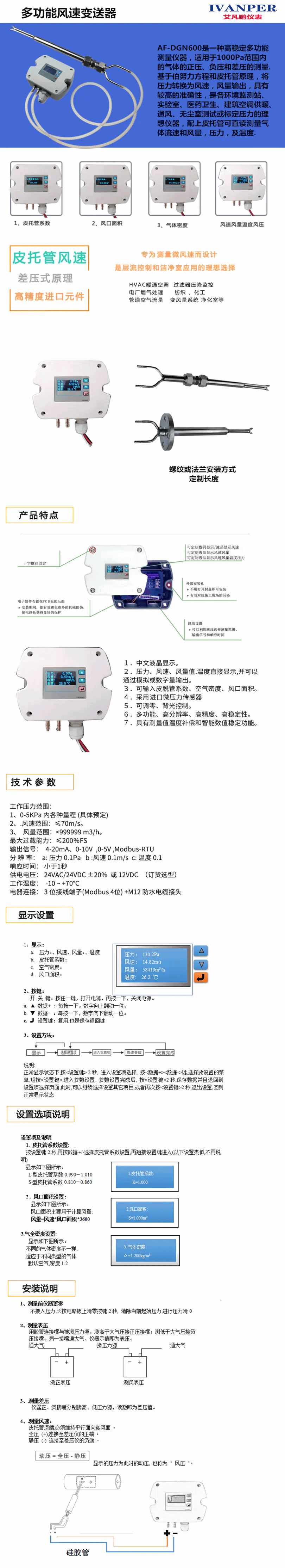 AF-DGN600是一种高稳定多功能测量仪器,适用于1000Pa范围内的气体的正压、负压和差压的测量.基于伯努力方程和皮托管原理,将压力转换为风速,风量输出,具有较高的准确性,是各环境监测站、实验室、医药卫生、建筑空调供暖、通风、无尘室测试或标定压力的理想仪器,配上皮托管可直读测量气体流速和风量,压力,及温度.