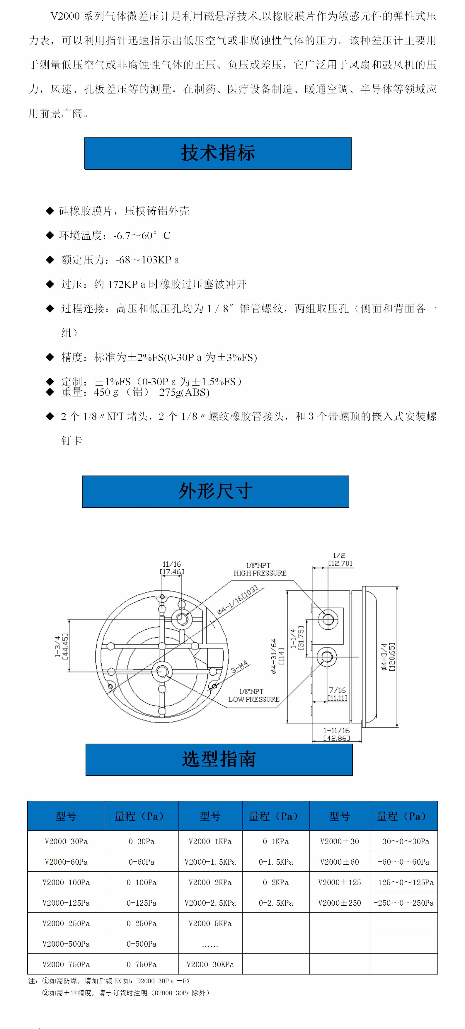 V2000系列气体微差压计是利用磁悬浮技术,以橡胶膜片作为敏感元件的弹性式压差表,可以利用指针迅速指示出低压空气或非腐蚀性气体的压力。该种差压计主要用于测量低压空气或非腐蚀性气体的正压、负压或差压,它广泛用于风扇和鼓风机的压力,风速、孔板差压等的测量,在制药、医疗设备制造、暖通空调、半导体等领域应用前景广阔。