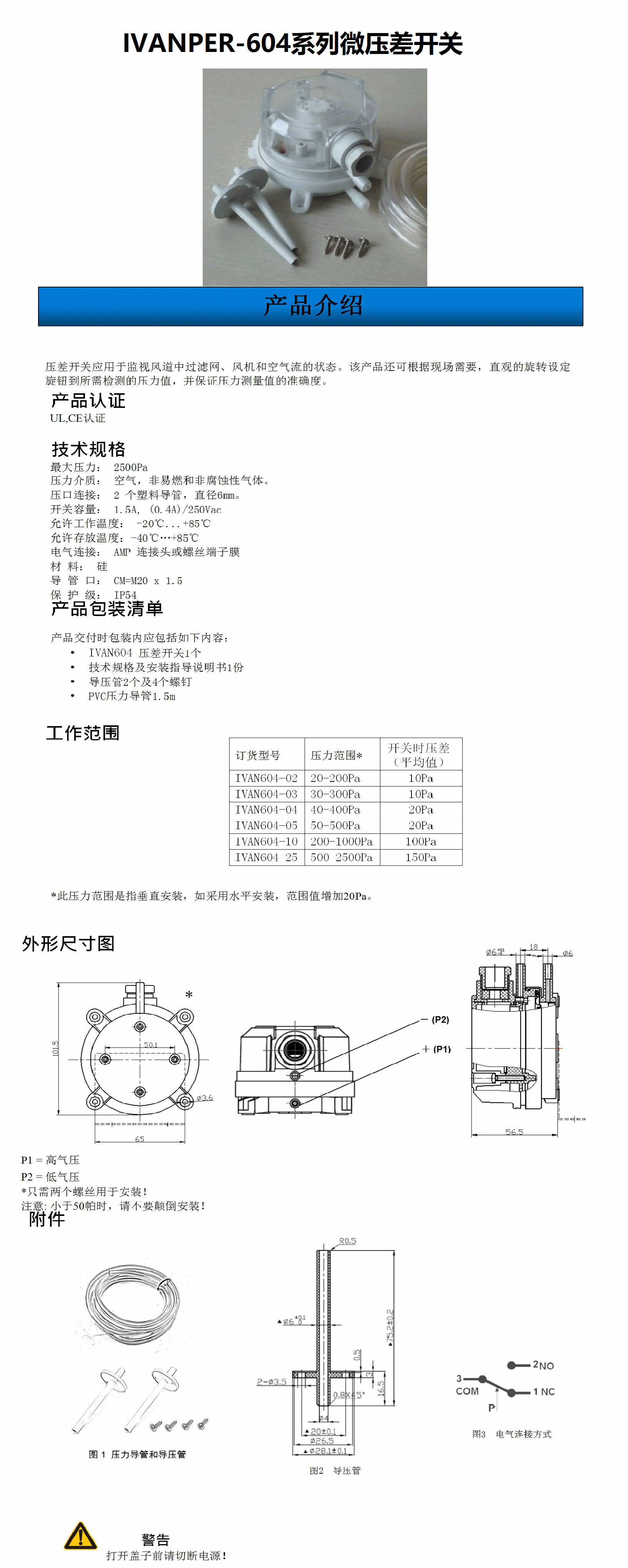 压差开关应用于监视风道中过滤网、风机和空气流的状态。该产品还可根据现场需要,直观的旋转设定旋钮到所需检测的压力值,并保证压力测量值的准确度。